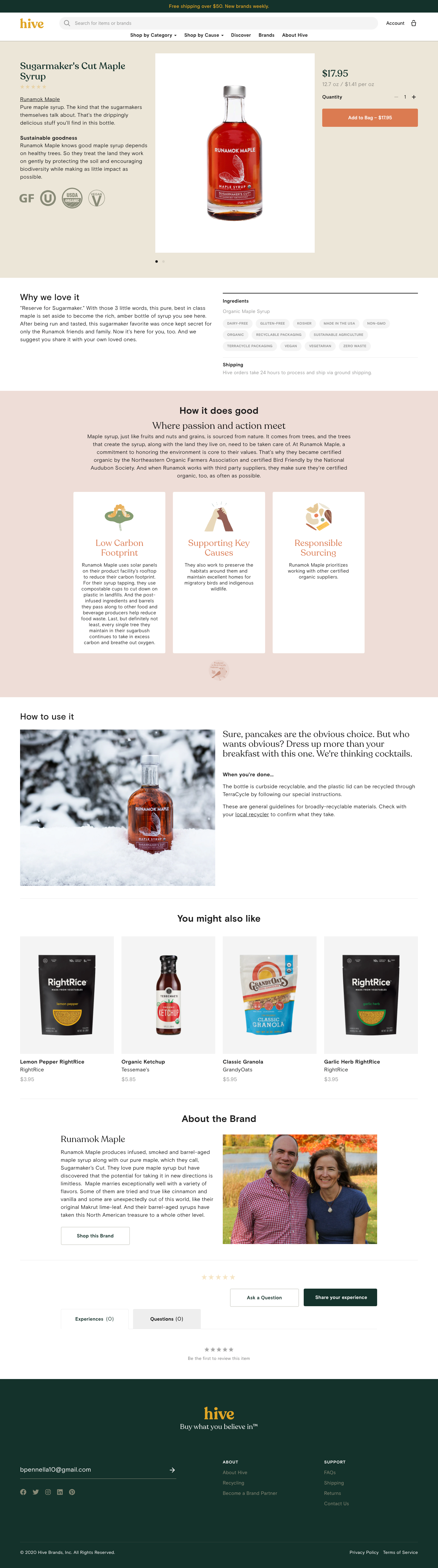 What is Hive? An e-commerce marketplace for sustainability-focused, socially-conscious brands. Carrying groceries, cleaning supplies, hard goods, and more, Hive’s mission is to help shoppers buy what they believe in. Each product has a story and a mission. As the Copy Lead and one of the first 12 hires at Hive Brands, I got to craft our brand voice from nothing, build out all of our content on the site (from writing myself to managing other writers), work across social, ads, marketing, emails, etc. Basically, as the sole, full-time writer, if it had words, I made it happen. Check out the site www.hivebrands.com. Here are some examples of the things I worked on from video to social and the box itself. I got to create an experience for each and every customer—and make it really, really memorable.